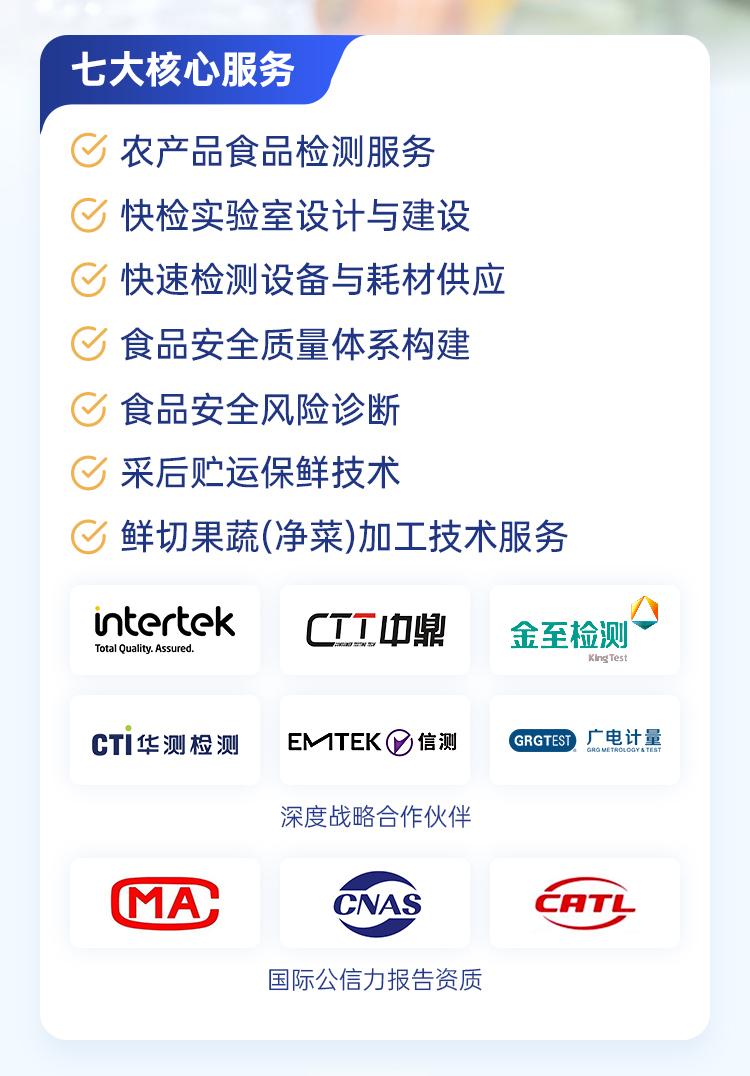 纵深全产业链:为食品及农产品从种植、加工、流通到消费的四大环节定制品控技术方案,通过智慧实验室设计、快检设备矩阵及人才培训实现服务落地,筑牢 “从农田到餐桌” 的质量长城。